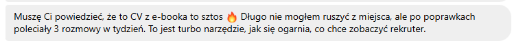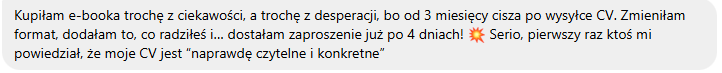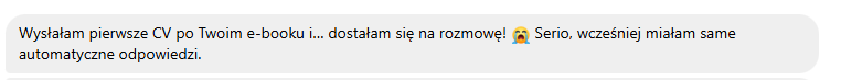 Żaden ebook ani kurs nie może tego uczciwie obiecać. Ten pakiet zwiększa Twoje szanse na to, że CV zostanie zauważone, przeczytane i nie odpadnie na etapie filtrów. Reszta zależy też od rynku i przebiegu rozmów.